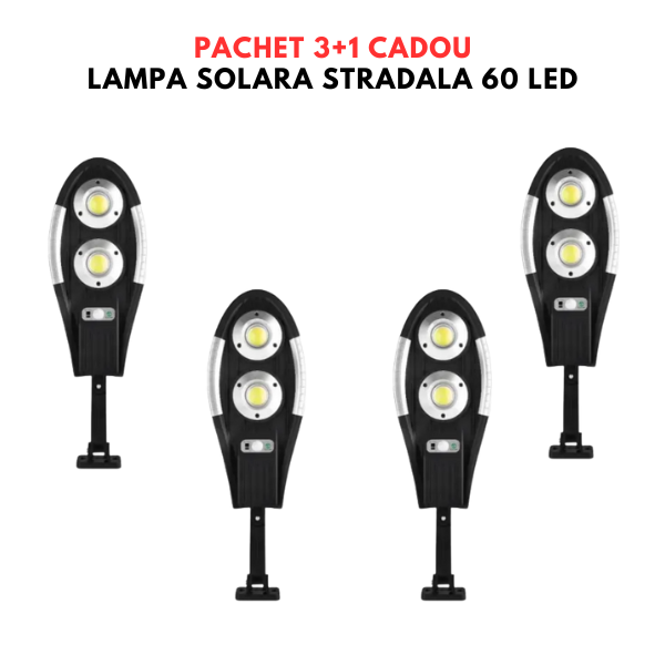Pachet 3+1 CADOU - Lampa Solara stradala 60 LED-uri, 3 moduri de functionare, cu telecomanda